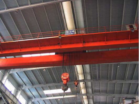 桥式起重机是横架于车间、仓库和料场上空进行物料吊运的起重设备。由于它的两端坐落在高大的水泥柱或者金属支架上,形状似桥。桥式起重机的桥架沿铺设在两侧高架上的轨道纵向运行,可以充分利用桥架下面的空间吊运物料,不受地面设备的阻碍。它是使用范围广、数量多的一种起重机械。